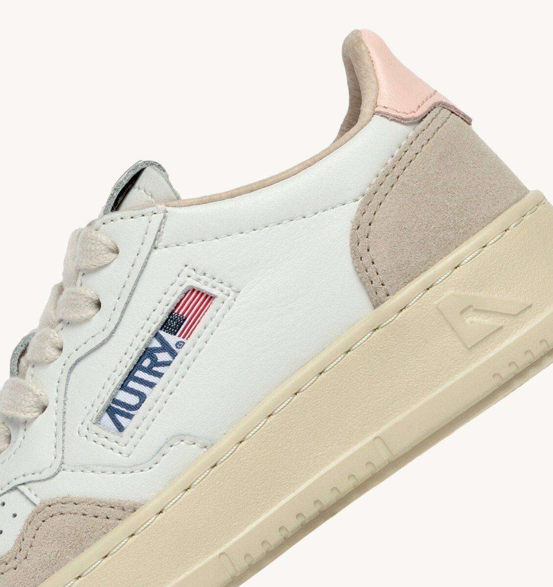 Crafted from suede in shades of white and pink, they rest on a comfortable rubber sole and stand out for the authentic, logoed details that are signature to Autry.