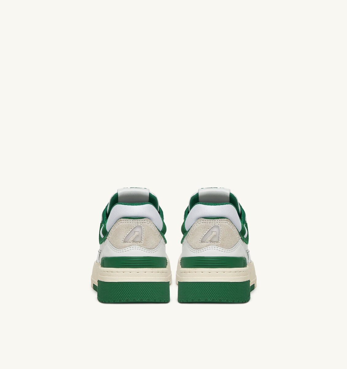 This men’s design is crafted from white leather with green suede details, characterized by a bold and welcoming shape with a padded mesh ankle collar and internal support that provides additional heel support. The distinctive feature is the high rubber sole with relief tread alternating between white and green, emphasizing the street energy of the design.