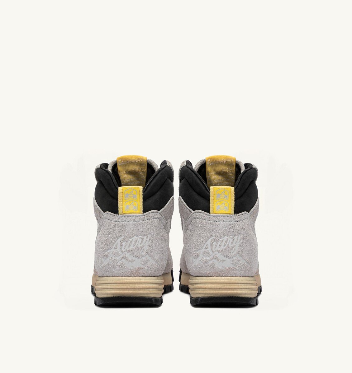 The upper is made of light gray suede, with tone-on-tone Cordura nylon side panels and tongue, while the collar is crafted from black nubuck leather. The two-tone tubular top laces ensure maximum durability.