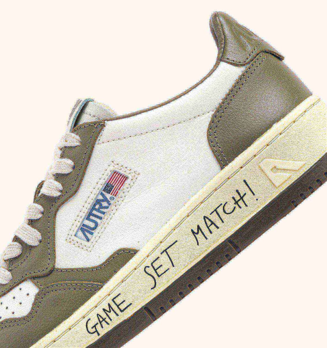 The rubber sole immediately evokes the atmosphere of tennis, with the custom “Game Set Match!” lettering in graffiti style. Autry’s typical side logo insert adds the finishing touch to the design.
