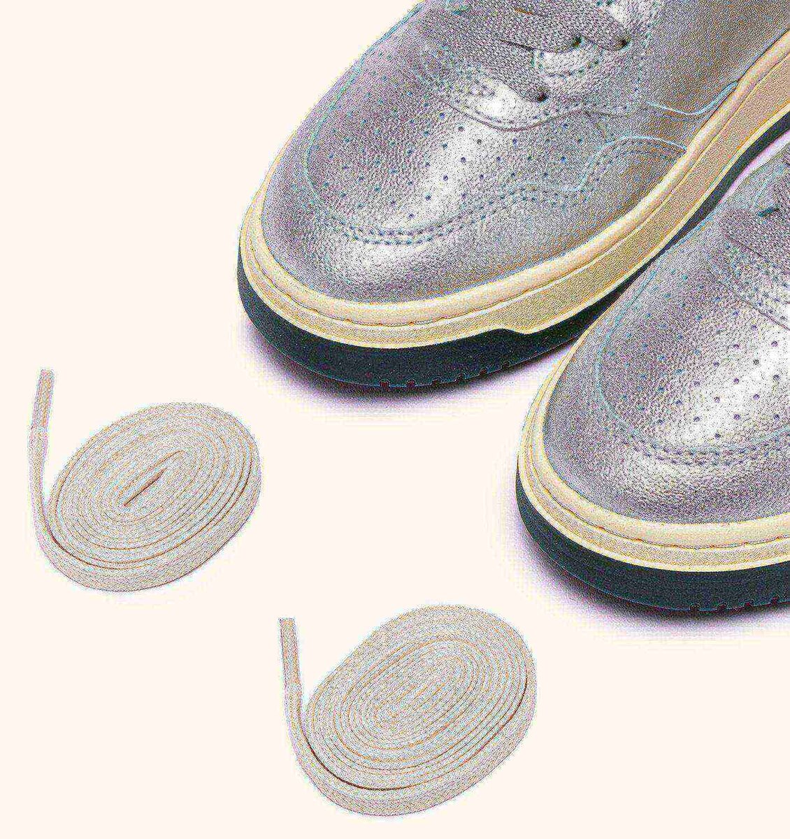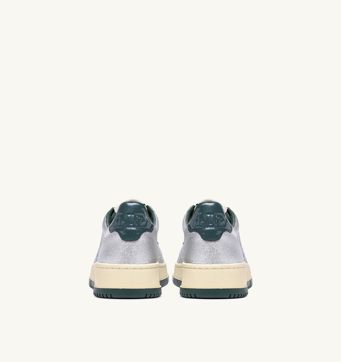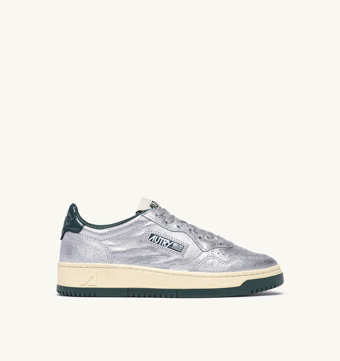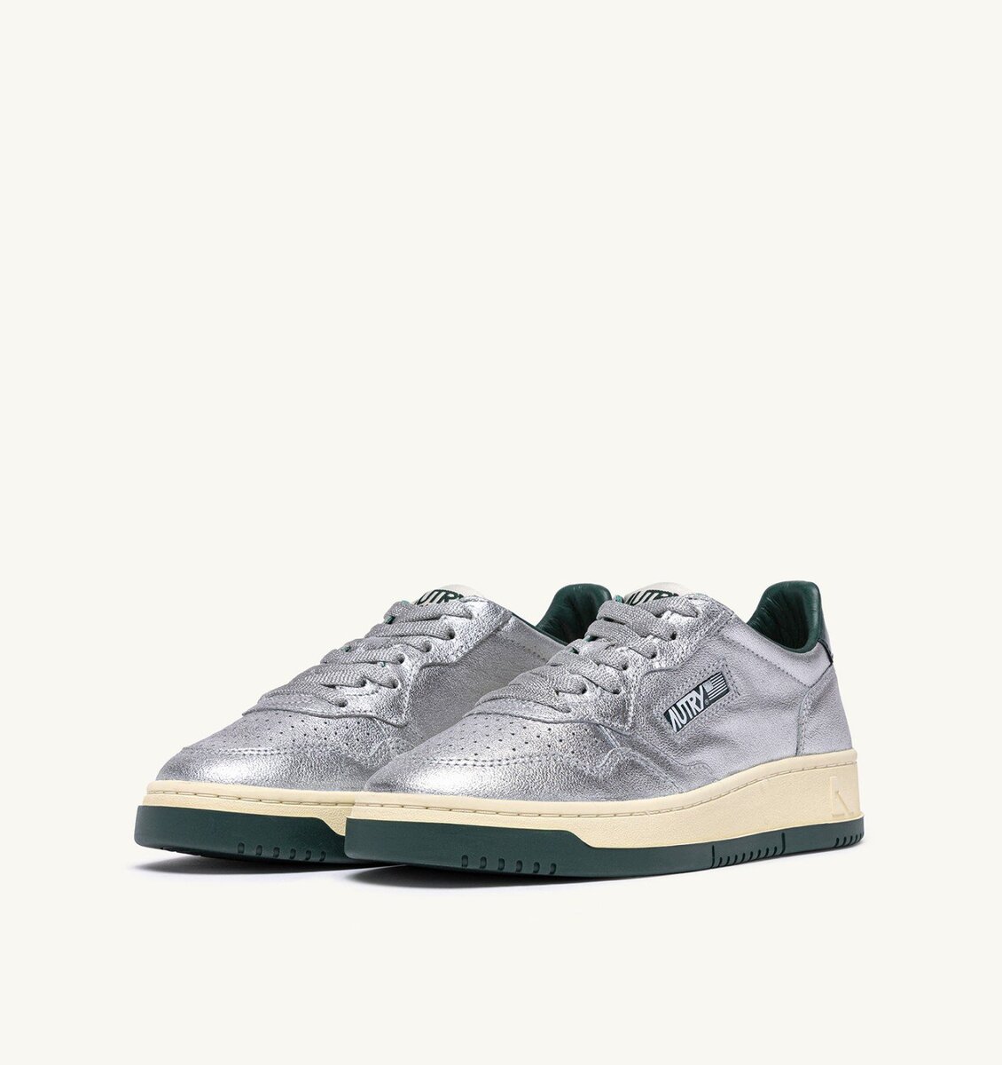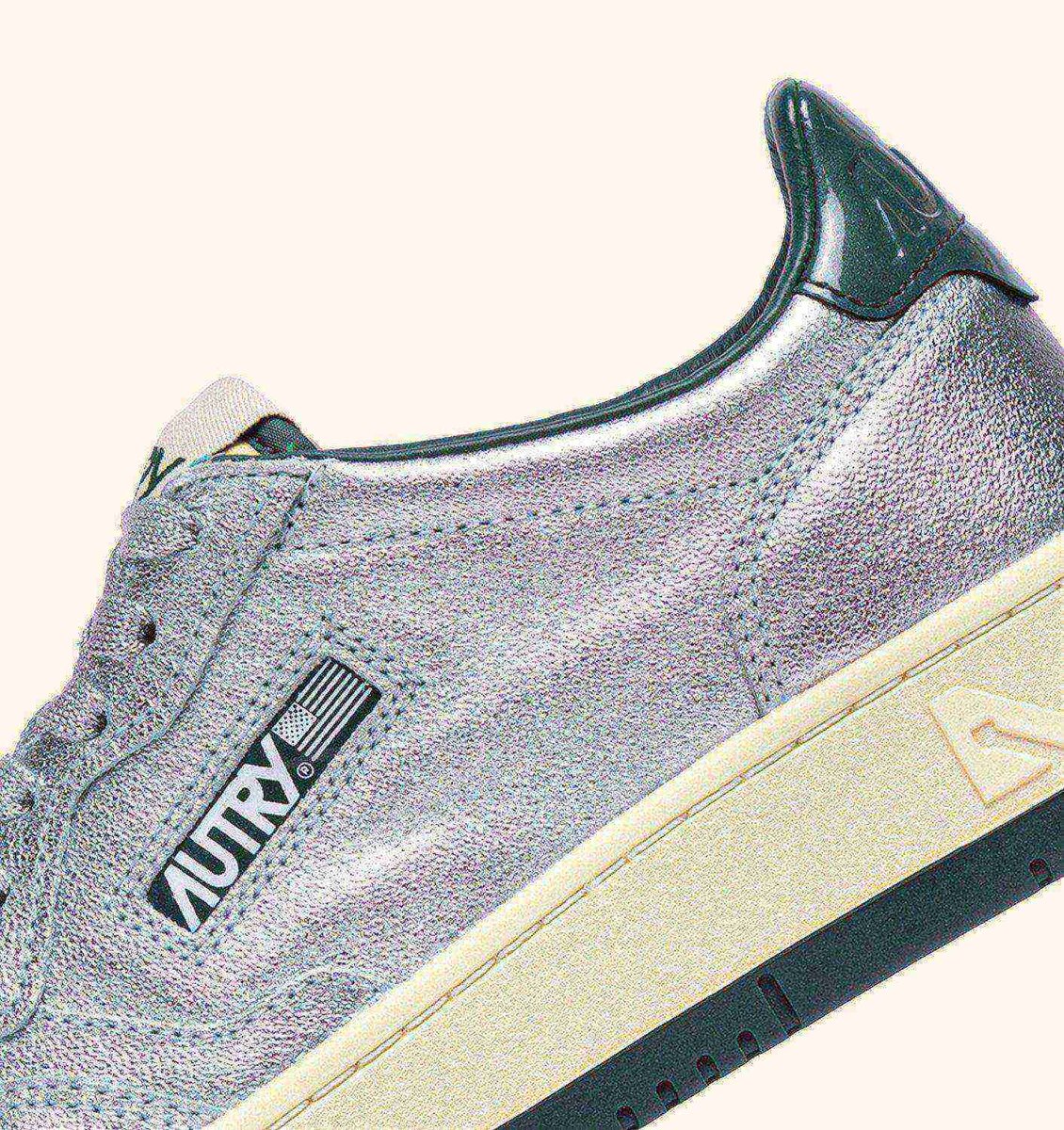 This men’s sneakers is crafted from metalized silver leather, finished with micro-perforations at the toe for excellent breathability. Details on the outer side and heel are made of patent green leather and personalized with the Autry logo, adding a touch of genuine originality.