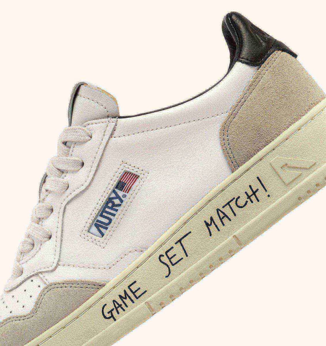 The black heel tab personalizes your look. The focus is on the flexible rubber sole, emblazoned with “Game Set Match!” handwritten lettering.