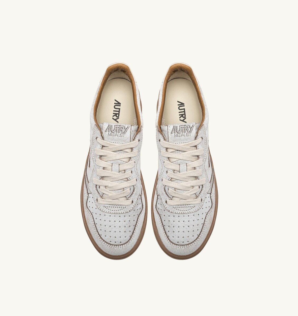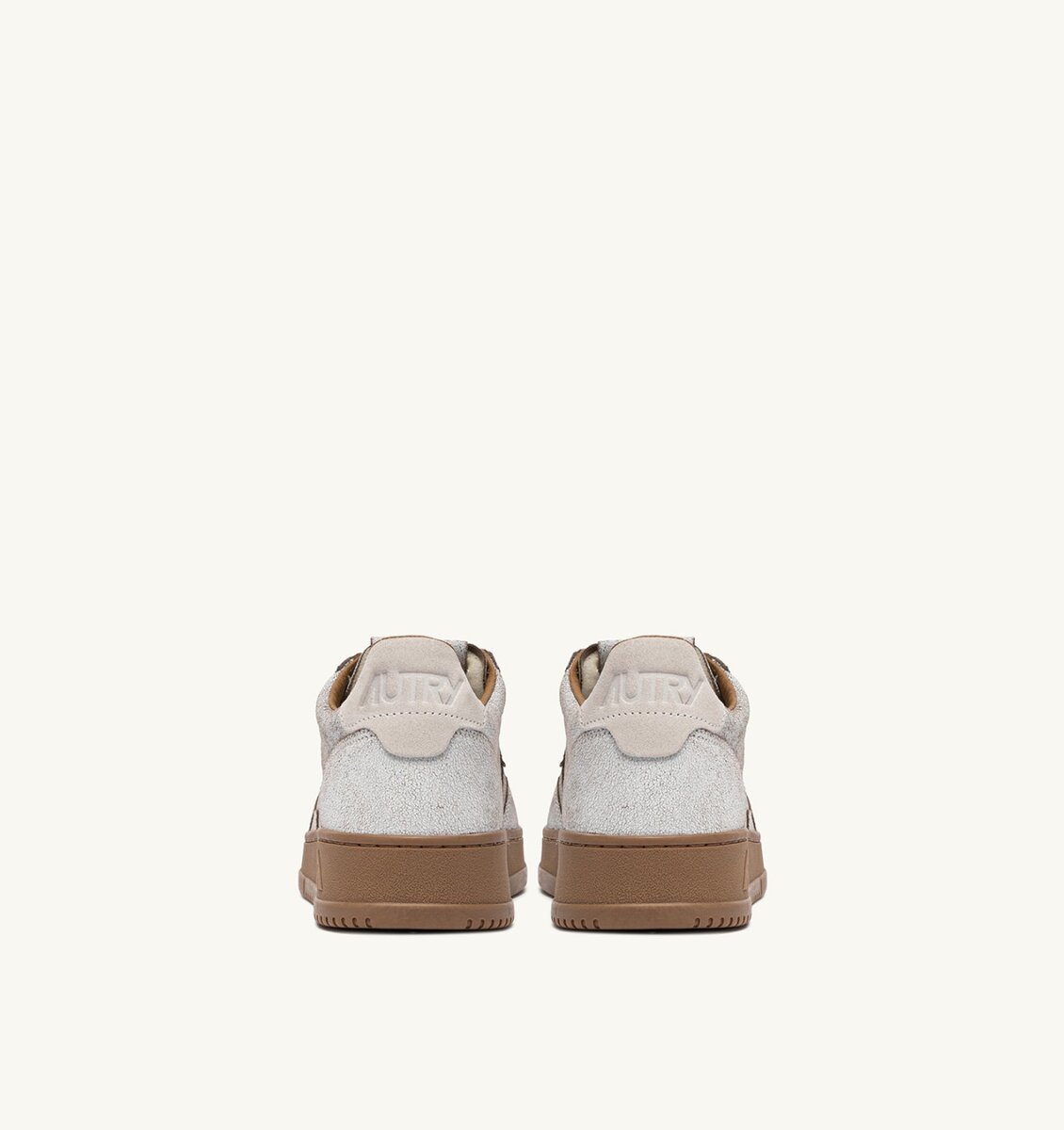 MEDALIST LOW SNEAKERS IN WHITE AND TOBACCO BROWN SCRAPED EFFECT SUEDE