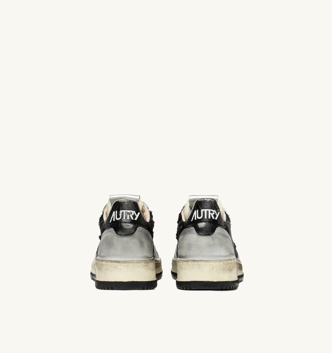 The special feature is the artisanal craftsmanship, designed and developed in Italy to create a unique, irregular used look for each pair. The high natural rubber sole is treated with dirty effects and finished with a black tread, emphasizing the graphic power of the design.