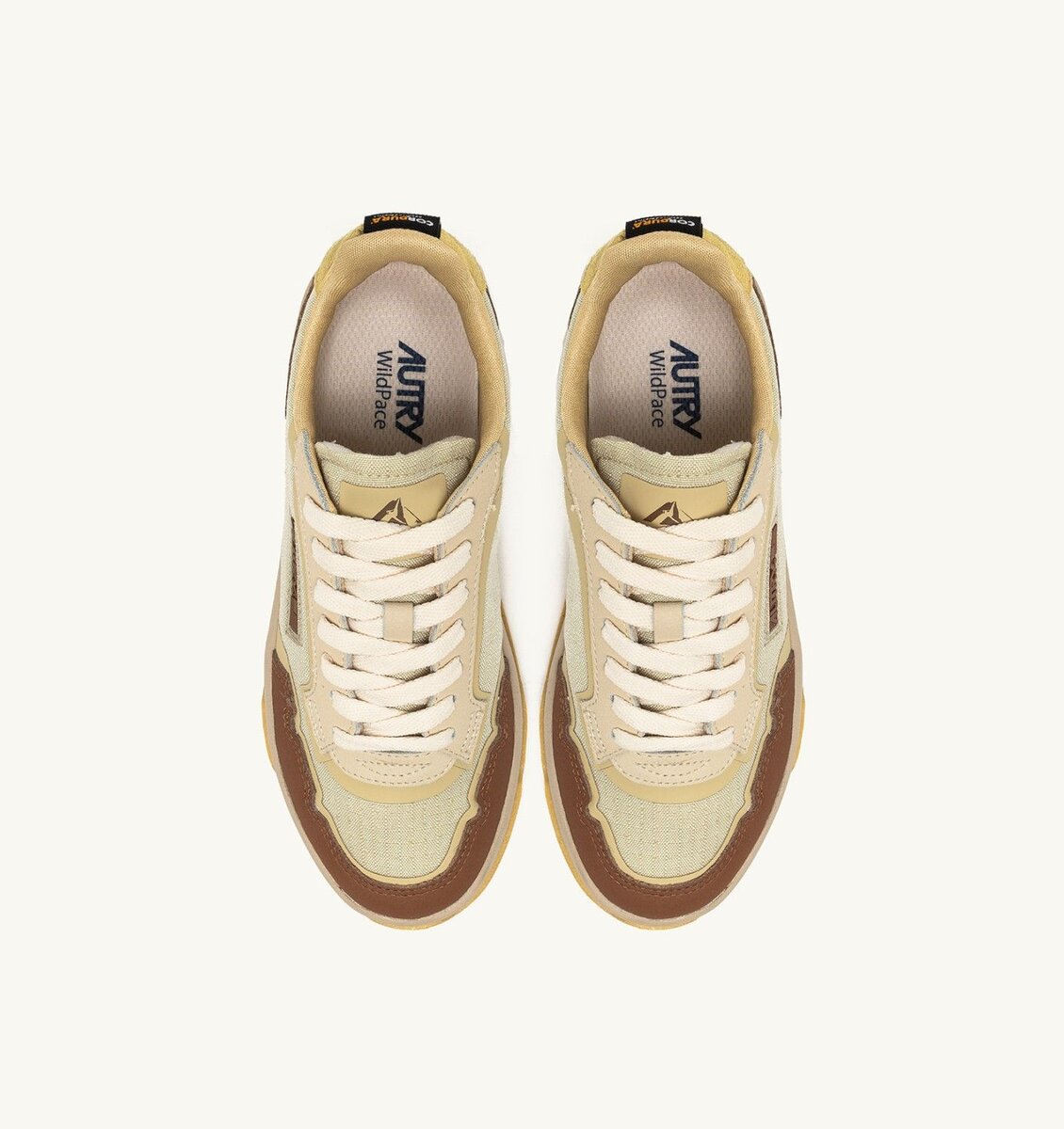 The new Autry Wildpace style stands out for its outdoor-inspired design, featuring technical details that enhance performance. Crafted from beige ripstop nylon and brown leather, this sneakers is enhanced with TPU-coated details, a side insert with the Autry logo in silicone, and a suede heel tab with an embossed logo.