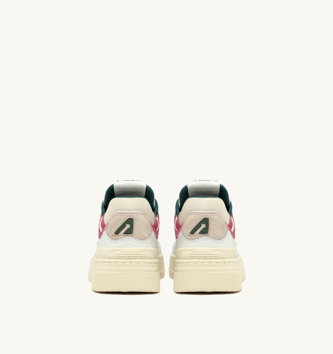 This women’s design is crafted from white leather with beige and pink suede inserts, characterized by a bold and welcoming shape with a padded mesh ankle collar and internal support that provides additional heel support. The distinctive feature is the high rubber sole with relief tread emphasizing the street energy of the design.