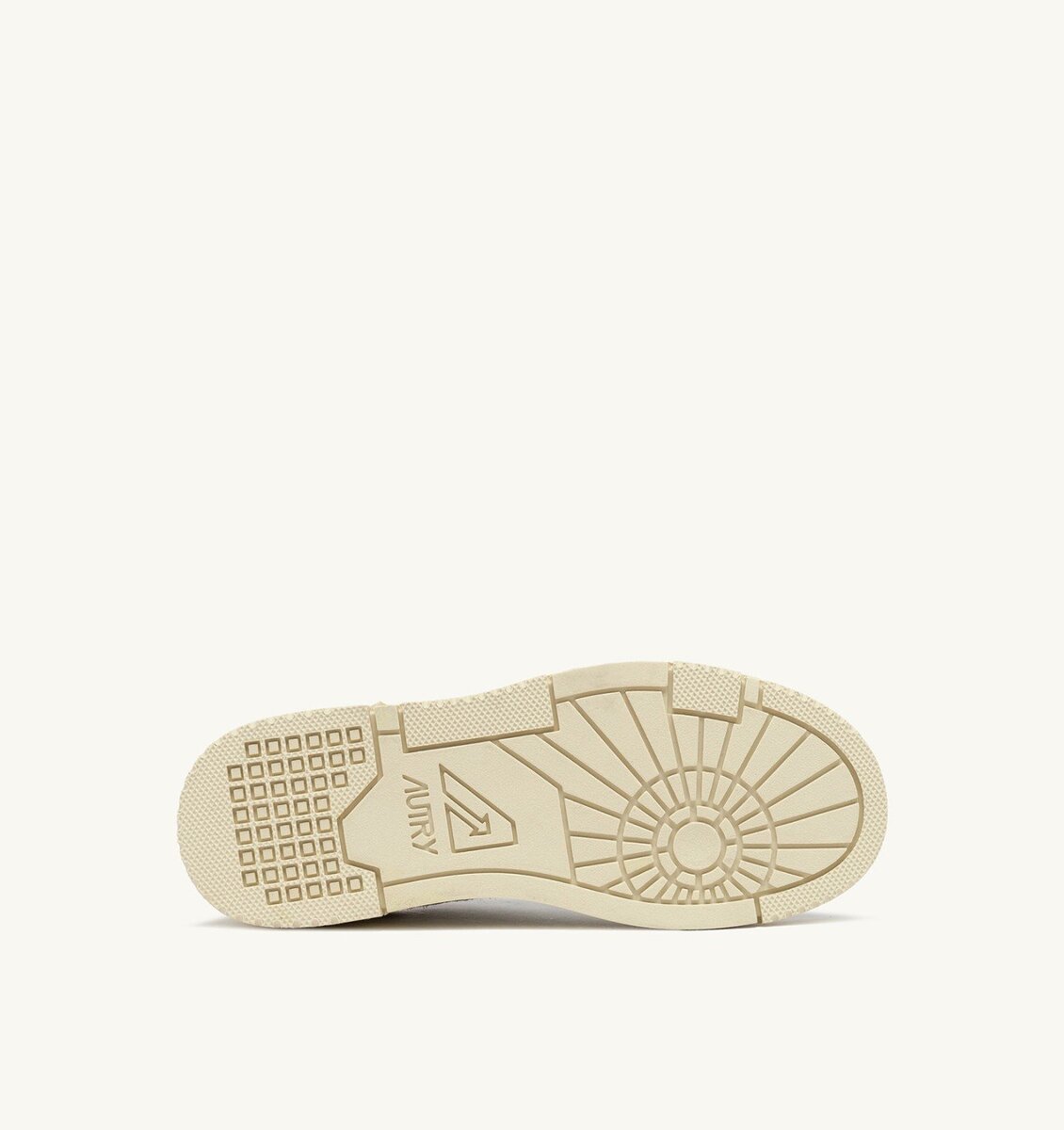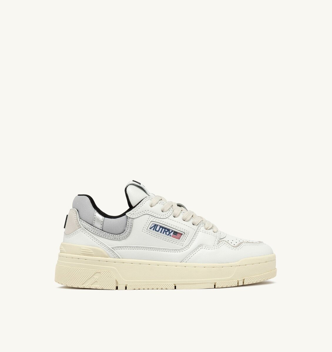 This women’s design is crafted from white leather with silver-tone metalized leather and beige suede inserts, characterized by a bold and welcoming shape with a padded mesh ankle collar and internal support that provides additional heel support. The distinctive feature is the high rubber sole with relief tread emphasizing the street energy of the design.