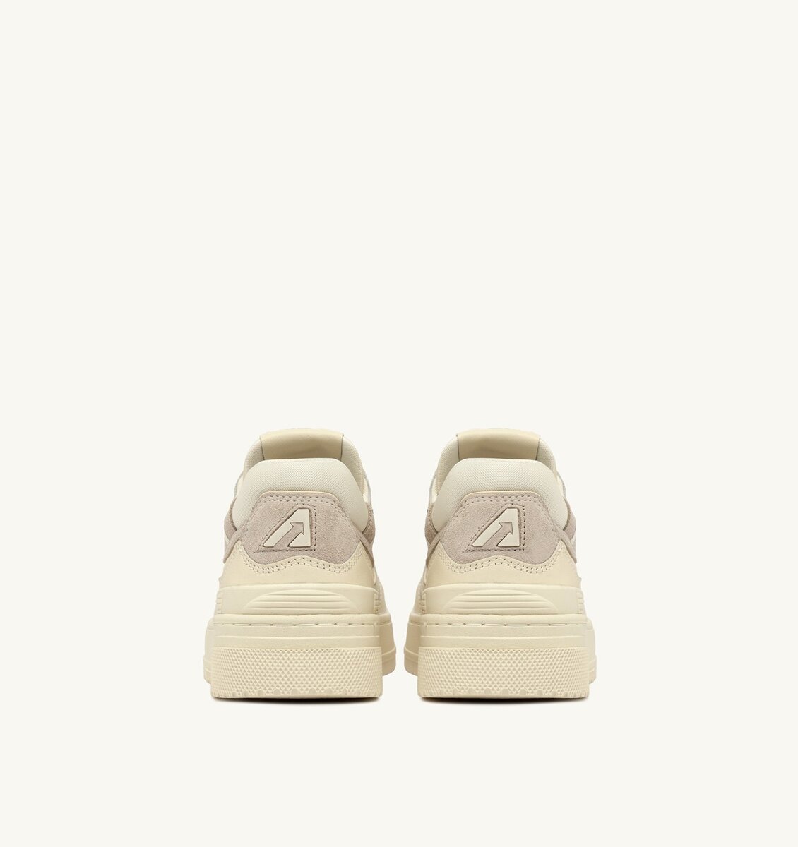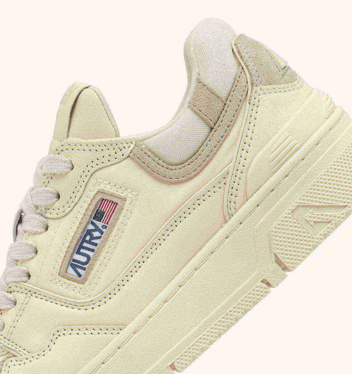 This monochromatic women’s design is crafted from soft lambskin and ivory white nylon with color matching suede details, characterized by a bold and welcoming shape with a padded mesh ankle collar and internal support that provides additional heel support. The distinctive feature is the color matching high rubber sole with relief tread emphasizing the street energy of the design.