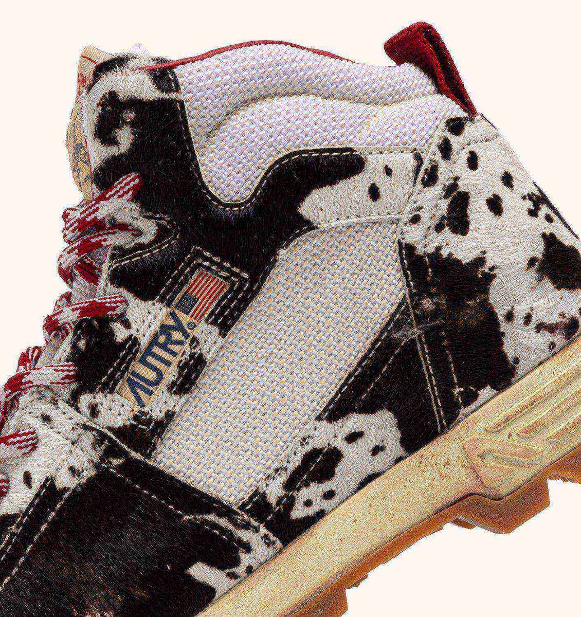 The upper is ivory white and brown pony hair effect, while the collar, tongue, and side inserts are crafted from ivory white mesh. The laces are two-tone and tubular to ensure maximum durability.