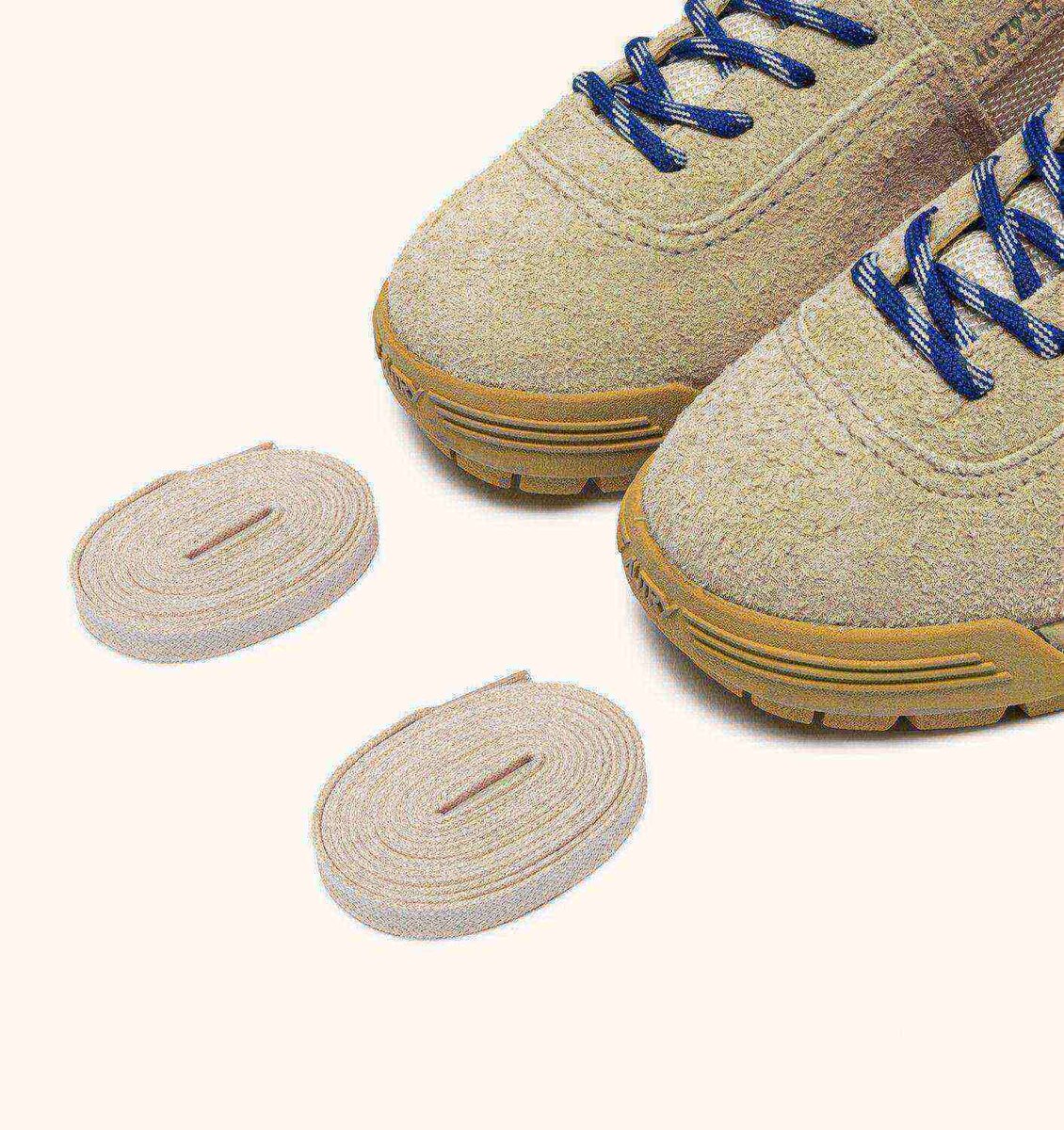 The upper is crafted from beige suede, with tone-on-tone Cordura nylon side panels and tongue, and a slightly darker beige collar. The two-tone tubular top laces ensure maximum durability.