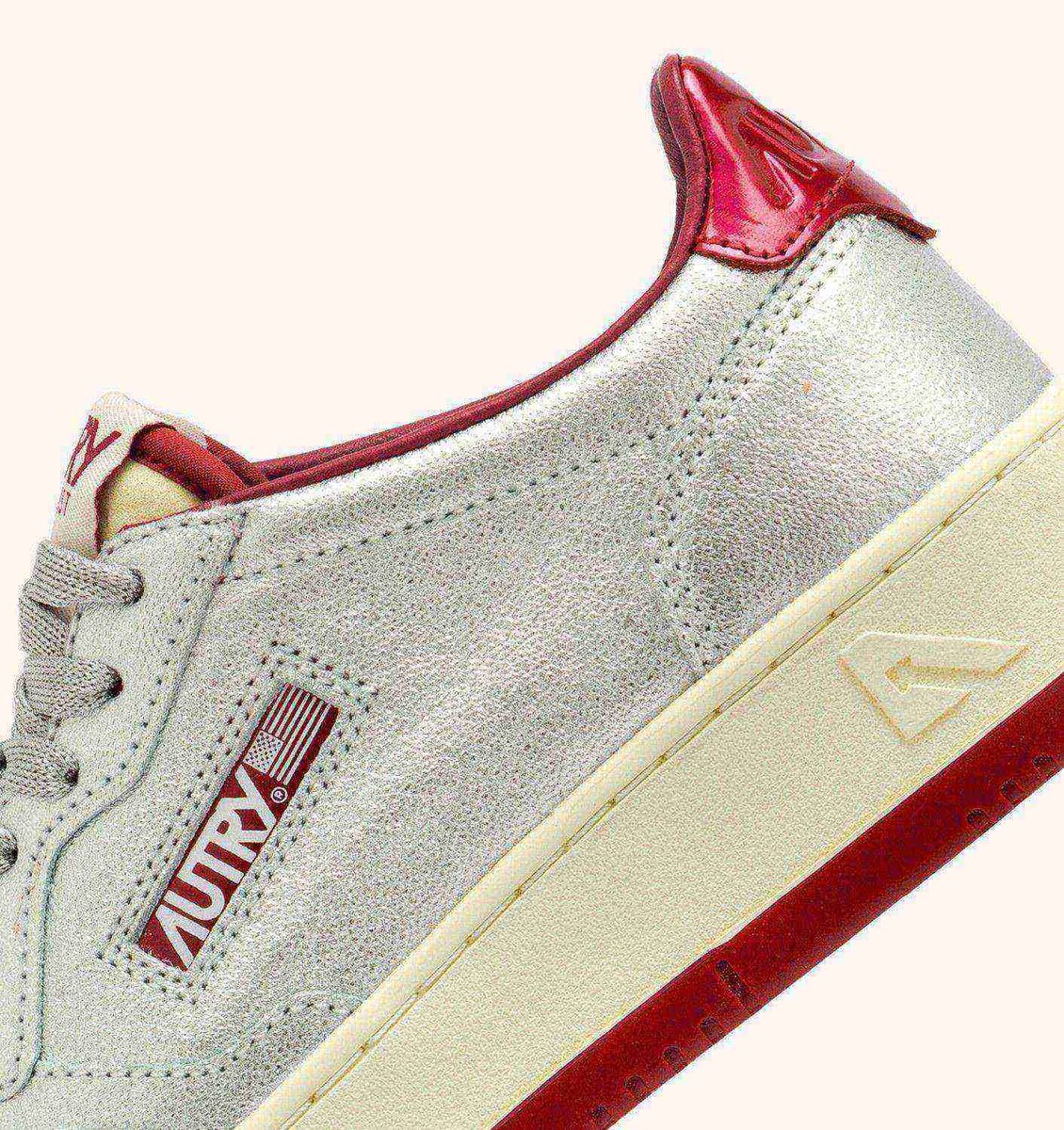 Cette basket pour femme est réalisée en cuir métallisé argenté, avec une finition micro-perforée sur la pointe qui offre une excellente respirabilité. Les détails sur le côté extérieur et au talon sont en cuir verni noir et personnalisés avec le logo Autry, pour une touche d’originalité authentique.