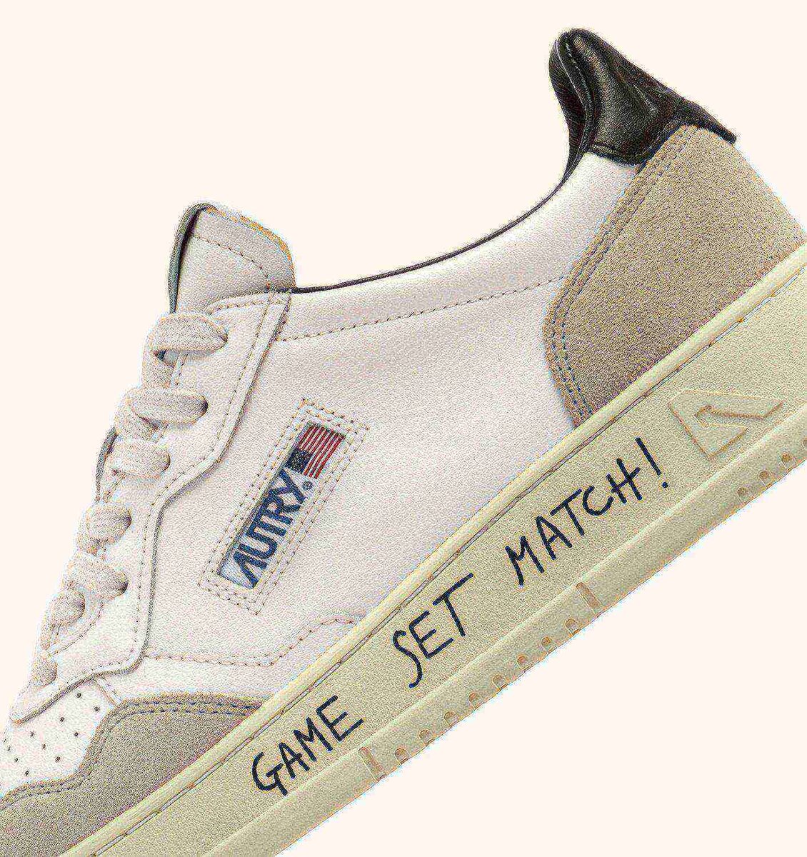 This women’s athletic shoe is crafted from white leather and comes with perforated toe and soft suede inserts on the sides, in addition to a black heel tab with logo for a touch of colour. The spotlight is on the rubber sole, personalized with the graffiti-style lettering “Game Set Match!”
