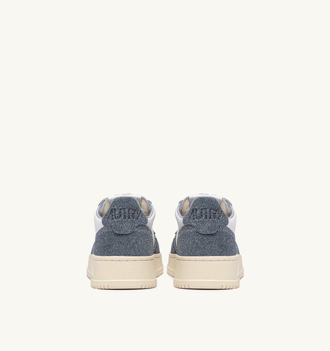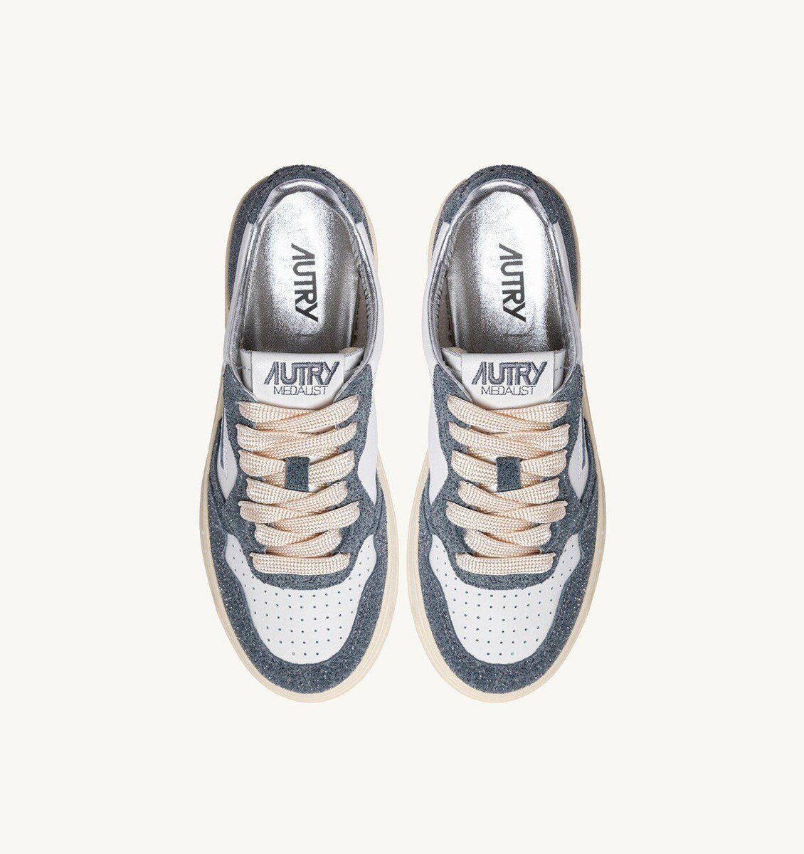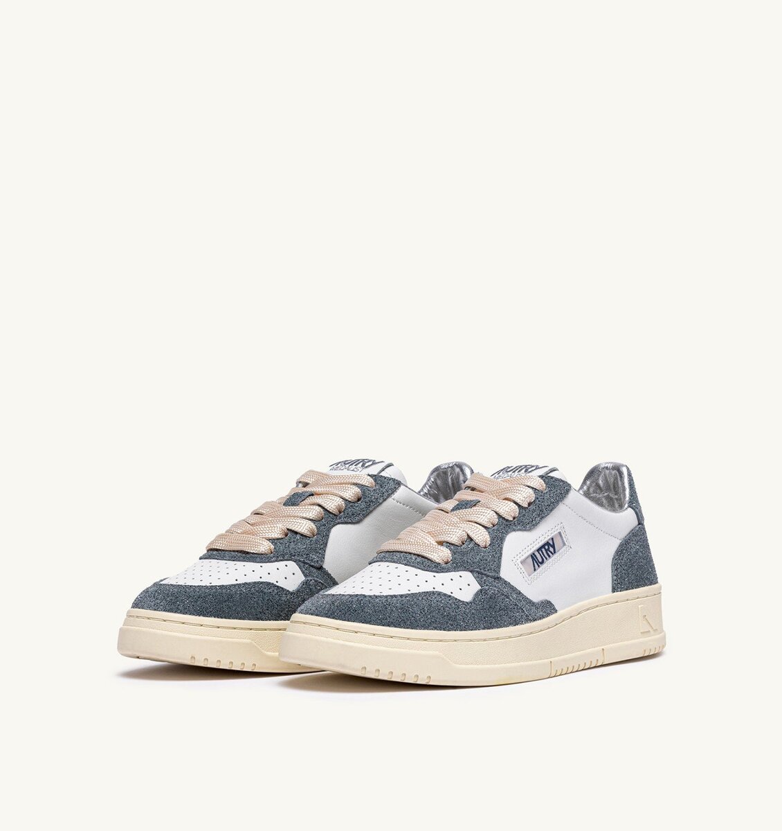 This women’s sneakers introduces a new take on the Medalist, crafted from white leather with unique gray glitter-effect inserts, offering a bold mix of textures and visual flair.