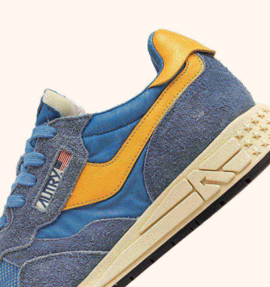 Innovative, light and extremely flexible, Reelwind Autry sneakers draw inspiration from the running world. The women’s style is crafted from a mix of bluette suede and nylon, with side panels in yellow leather.