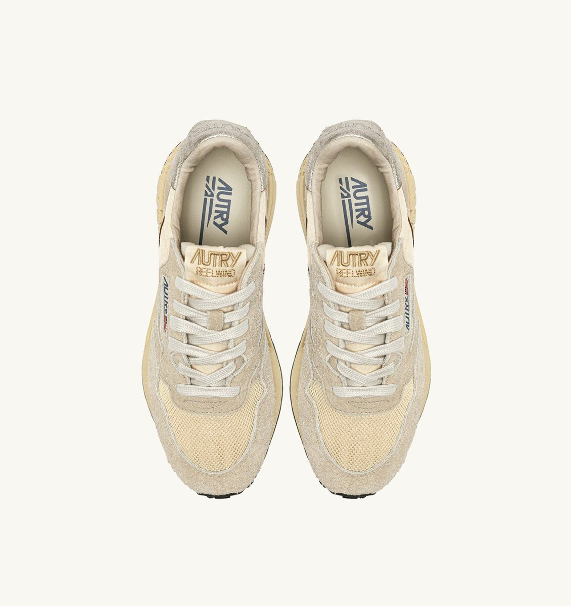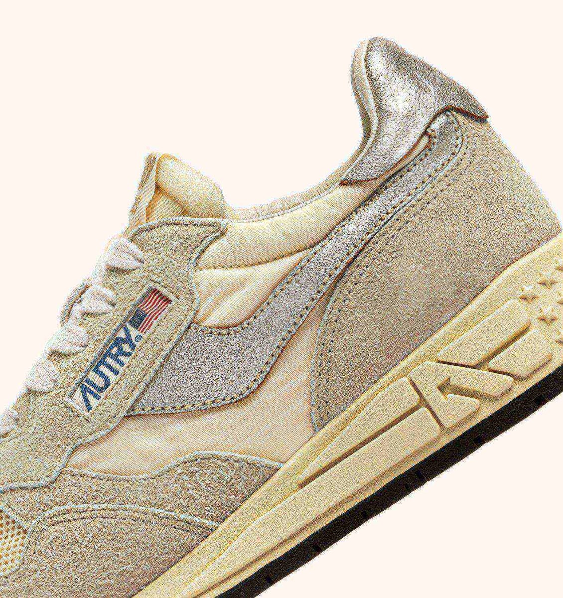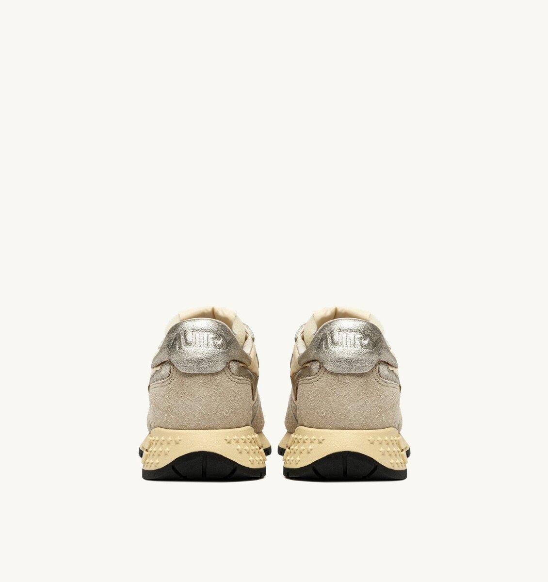 Reelwind low sneakers offer the technical edge of a performance sports shoe with the unmistakable style of the Autry aesthetic. This women’s athletic shoe is crafted from beige nylon and is reinforced by inserts in color matching suede and platinum color metalized leather that create a dynamic design.