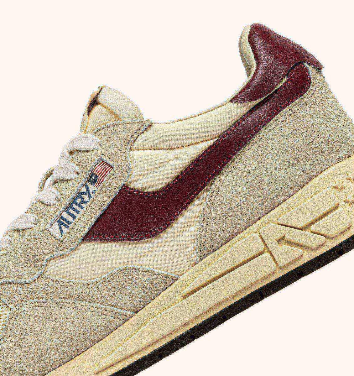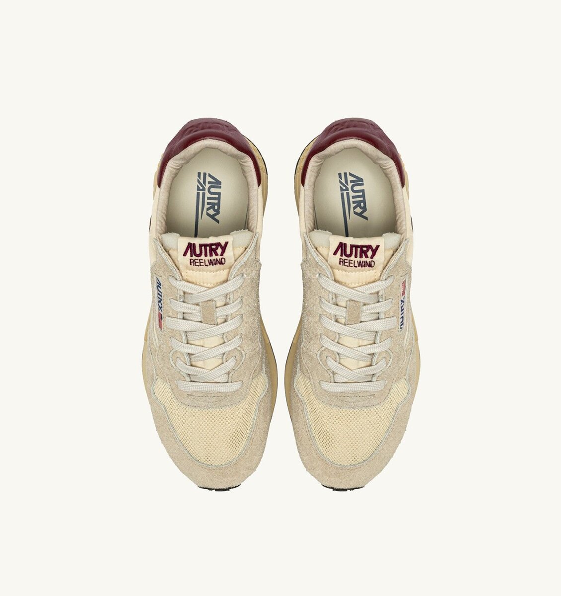 Reelwind low sneakers offer the technical edge of a performance sports shoe with the unmistakable style of the Autry aesthetic. This women’s athletic shoe is crafted from beige nylon and is reinforced by inserts in color matching suede and burgundy leather that create a dynamic design.