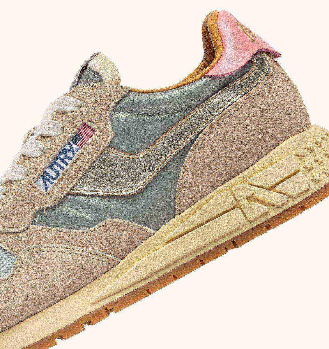 This women’s athletic shoe is crafted from reflective gray nylon in silver tones and is reinforced by beige suede and gold-tone metalized leather inserts that create a dynamic design. Lightweight and streamlined, it is completed by a rubber and Phylon running sole that softens the impact on the road or on the pitch.