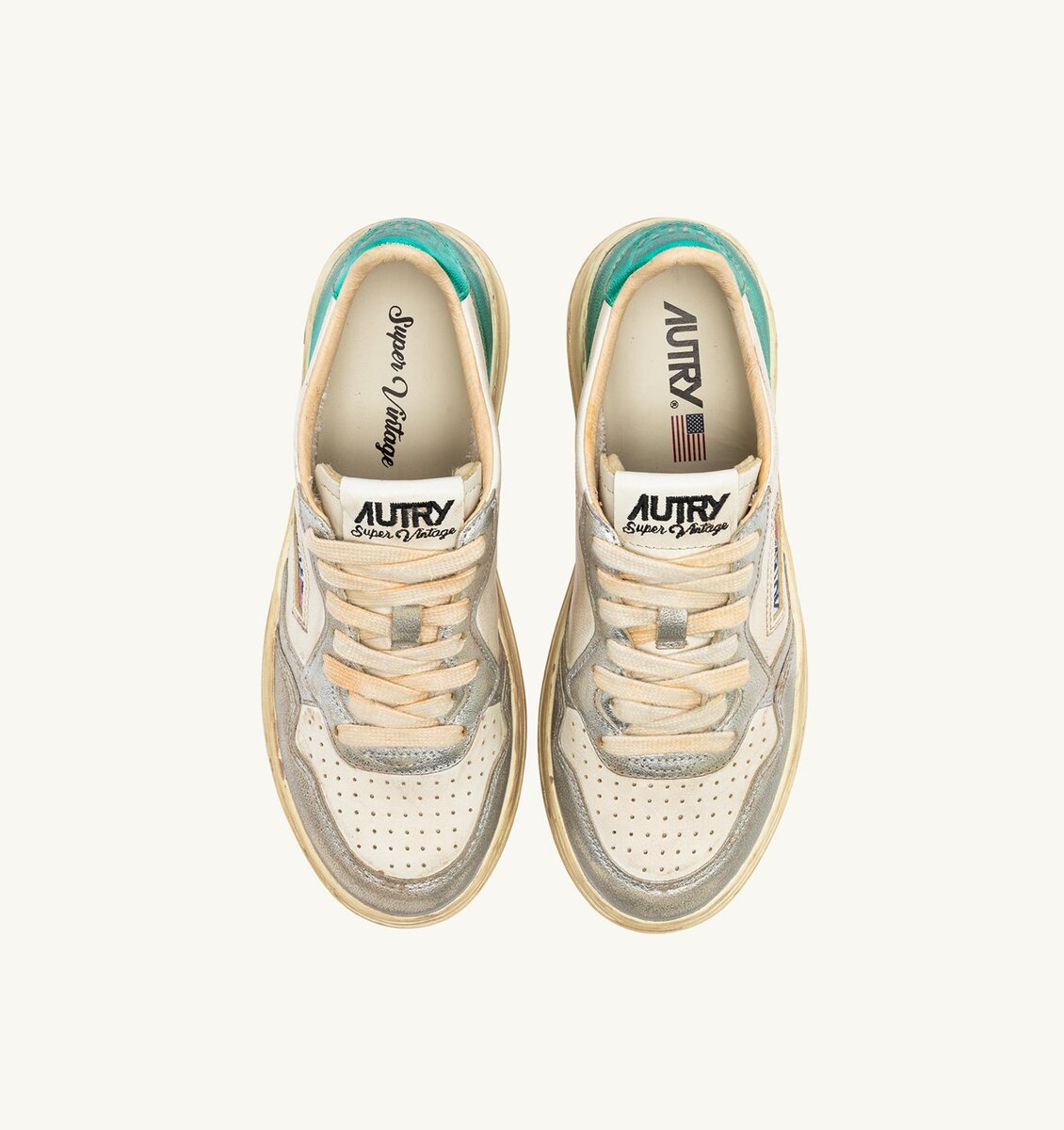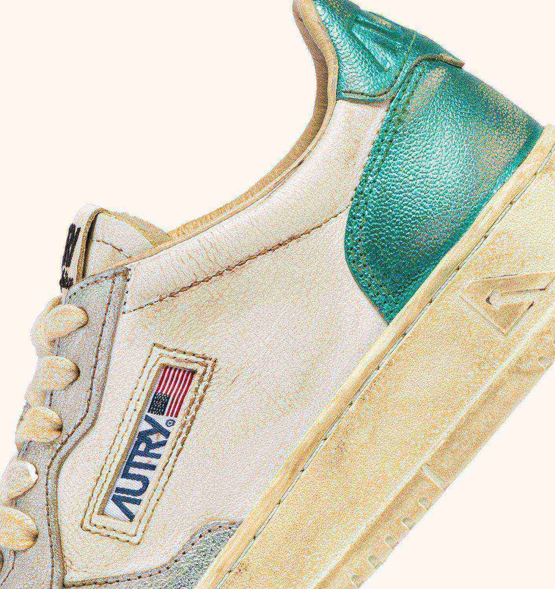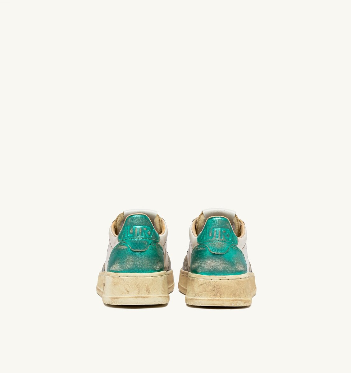 These women’s athletic shoes are made from soft leather with a lived-in appearance in white, metalized green and silver tones. The side insert draws attention to the distinctive Autry logo. The exclusive treatment used to create the vintage look is entirely Made in Italy.