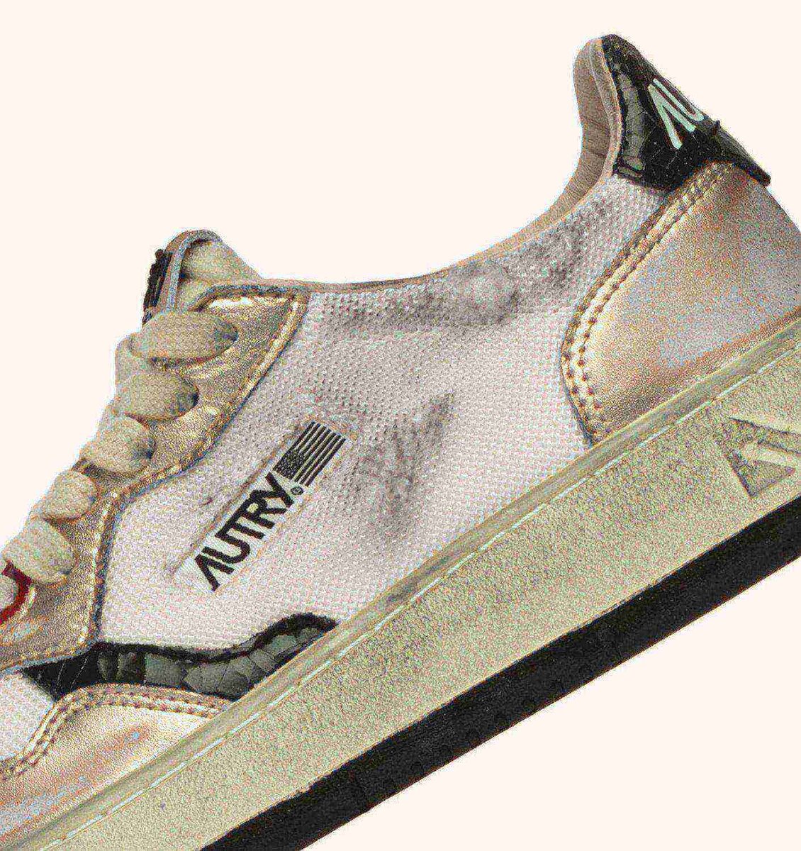 This women’s Medalist Super Vintage sneakers exudes a confident, street-savvy vibe. This sneakers is re-engineered in white mesh fabric, with gold-tone suede accents and black crackled-leather detailing.