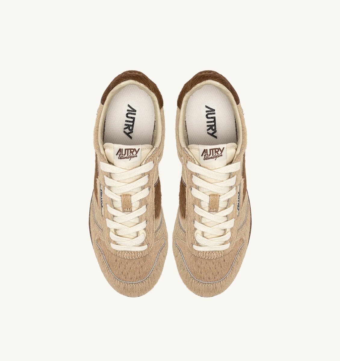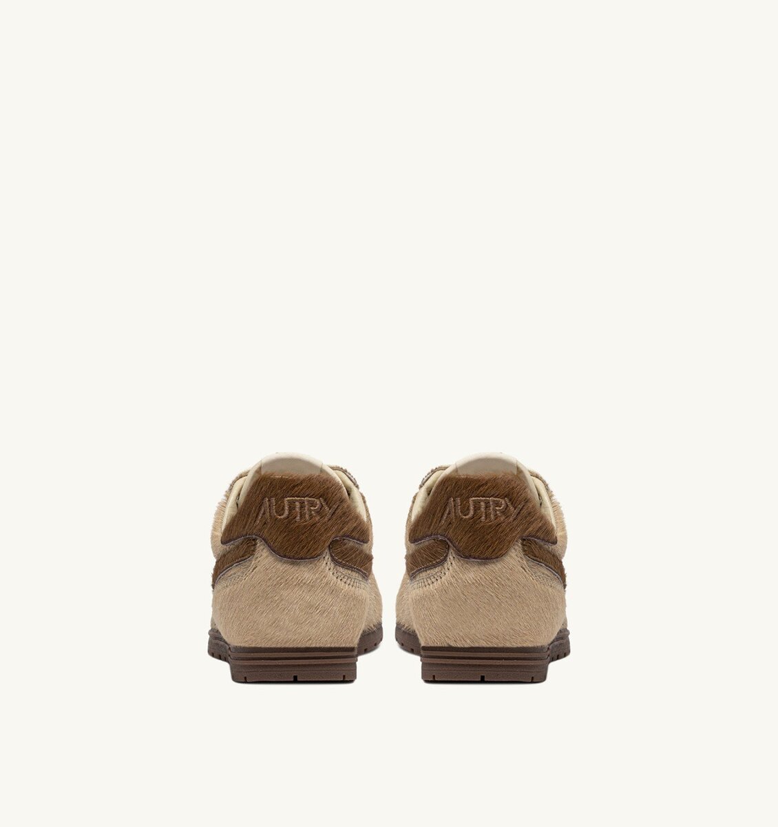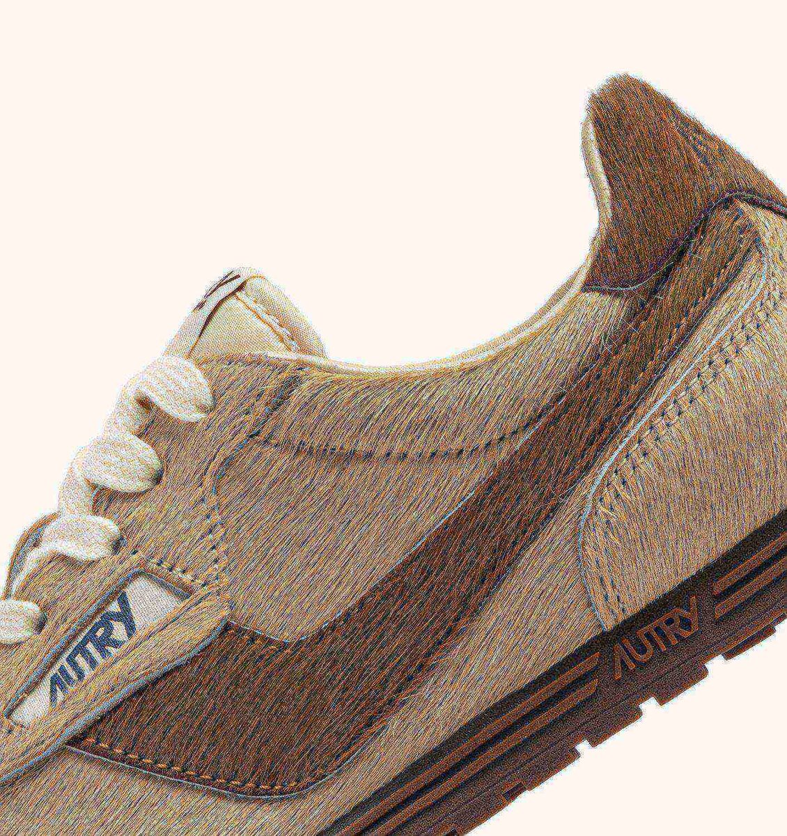 Crafted from beige and brown pony hair effect, the Windspin features a sleek, streamlined silhouette. Its flat, dynamic profile embodies Autry’s signature fusion of vintage charm and modernity. The ultra-flat rubber sole ensures excellent grip on all urban surfaces.
